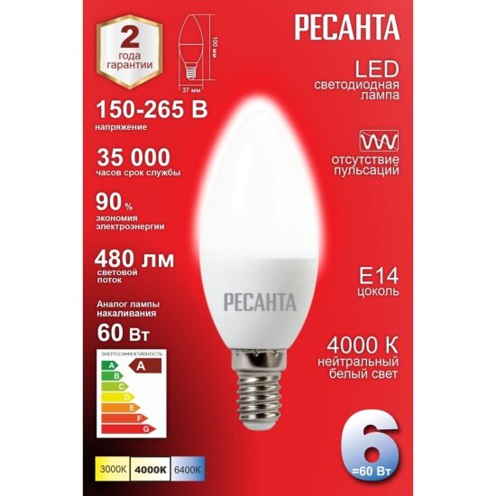 Светодиодная лампа Ресанта LL-R-C37-6W-230-4K-E14 (свеча, 6Вт, нейтр, Е14), 76/1/4 интересное: