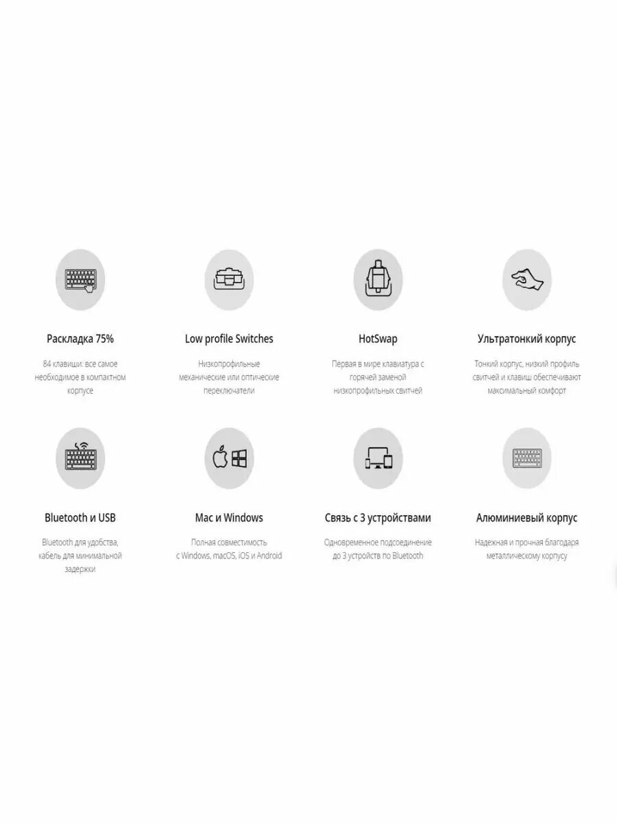 | Плюсы: | Выглядит как продукт премиум-класса, алюминиевый корпус даёт о себе знать. Печатать на ней одно удовольствие, мисклики случаются, но это дело привычки.