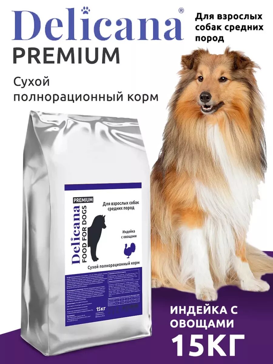 Корм сухой Delicana для собак средних пород Индейка с овощами, 15 кг