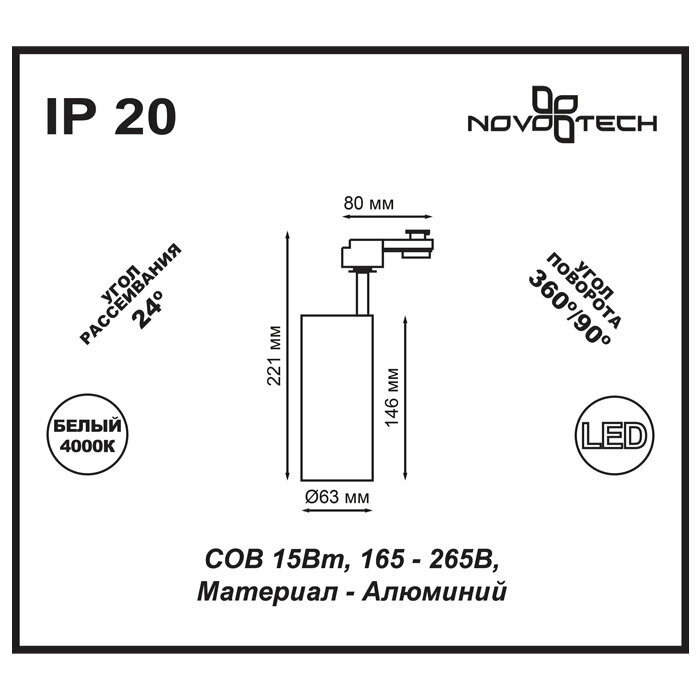 Светильник трековый однофазный трехжильный светодиодный | NOVOTECH | SELENE | 359152 | LED | 4000K | IP20 |