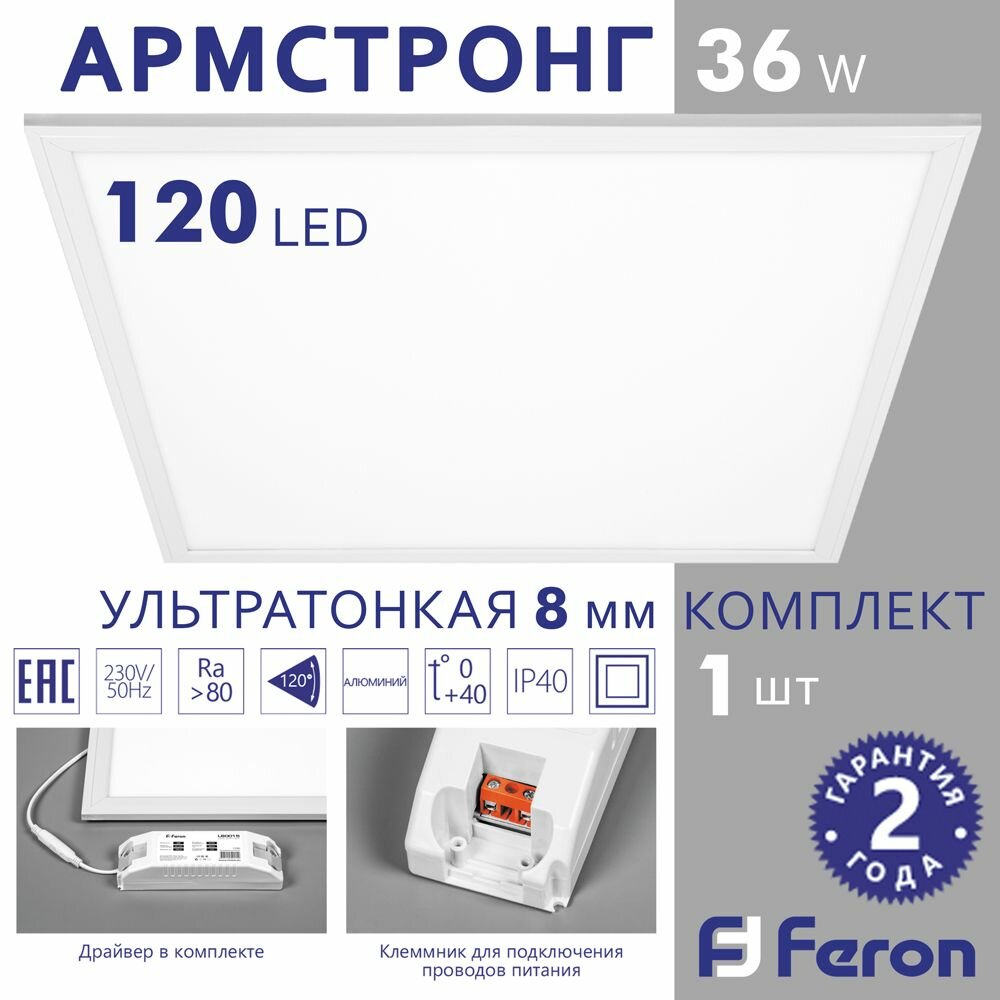 Армстронг встраиваемая светодиодная панель ультратонкая 36W 4000K цвет свечения белый Feron AL2113, драйвер, комплект 6 шт.