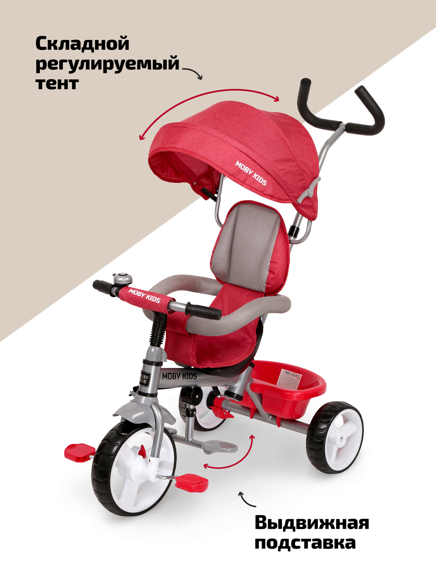 | Дополнительная информация | 3 в 1: велосипед-коляска с полным родительским управлением, трёхколёсный велосипед с ручкой, трёхколёсный велосипед и полное управления ребёнком; наличие переключателя «свободного хода» переднего колеса; звонок на руле; складной тент колясочного типа с фиксаторами положения; большая корзина сзади велосипеда; ножной тормоз |