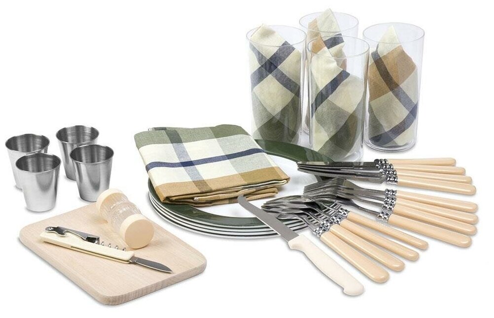 | Комплектация | 4 тарелки 4 бокала 4 стопки 4 ложки 4 вилки 4 ножа 1 разделочный нож 1 штопор-открывашка 1 доска разделочная 1 солонка 1 скатерть 4 салфетки |