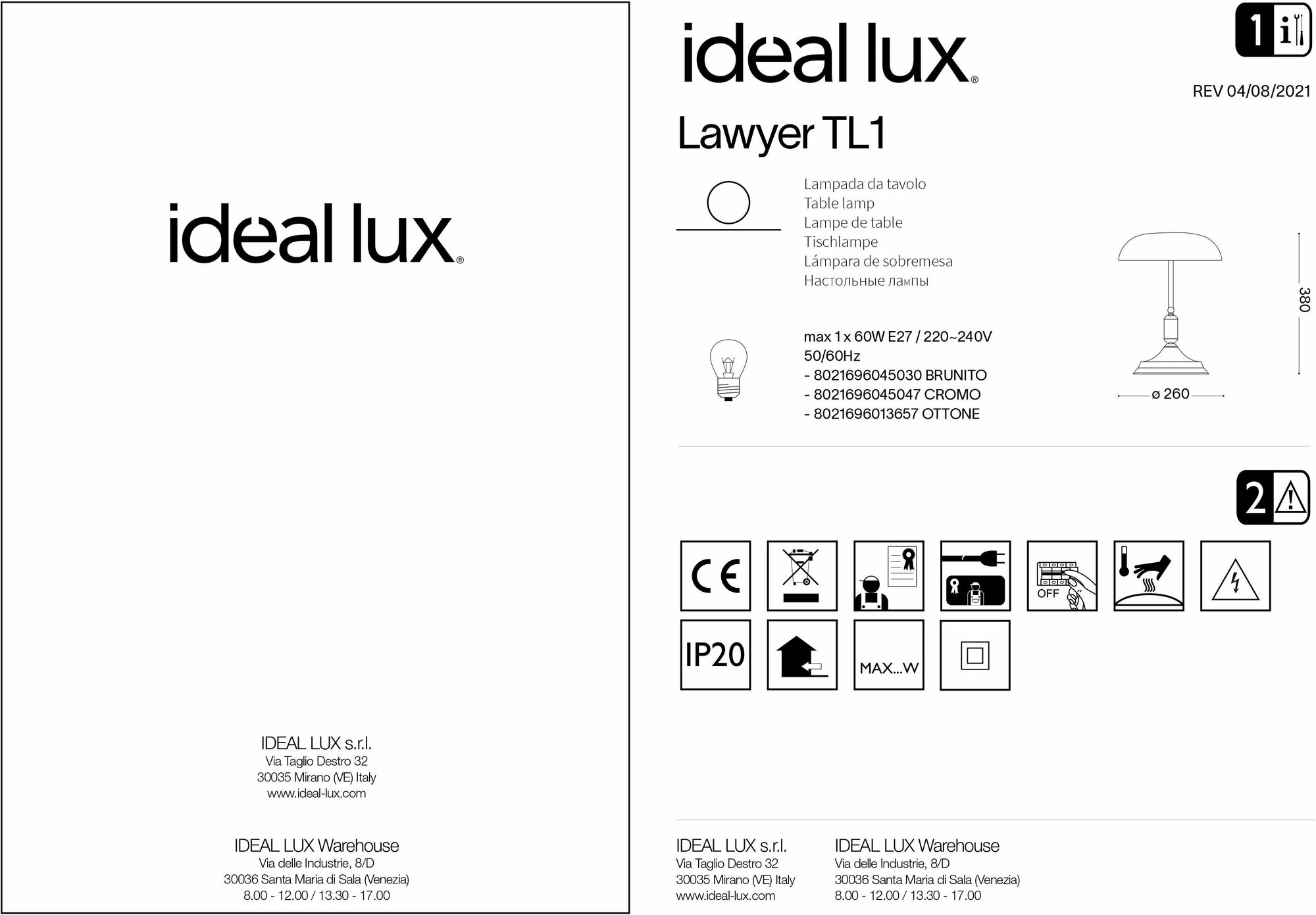Светильник настольный ideal lux Lawyer TL1 макс.1х60Вт IP20 Е27 230В Хром/Белый Металл/Стекло Выключатель Без лампы 045047.