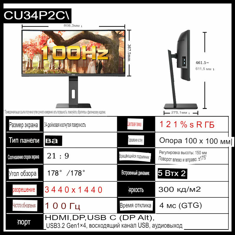 Монитор AOC 34"(3440x1440) AOC CU34P2C /матрица VA Матовая /Встроенные колонки Регулировка высоты