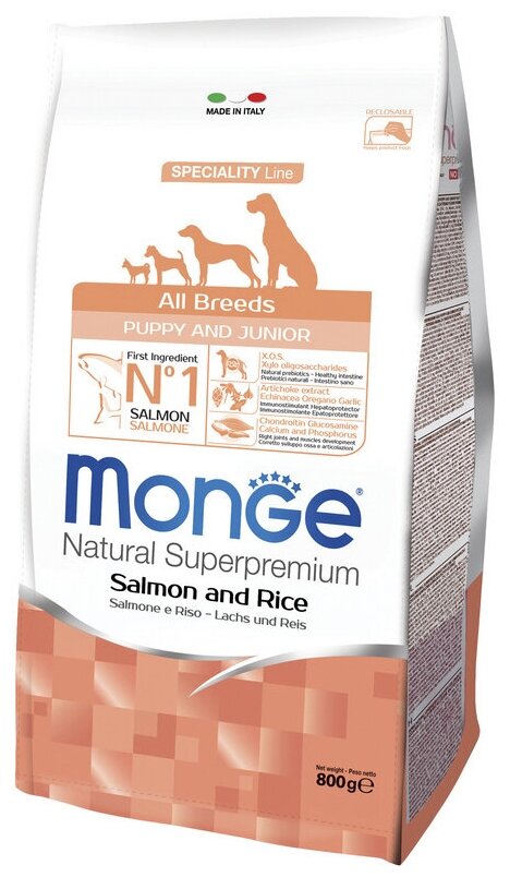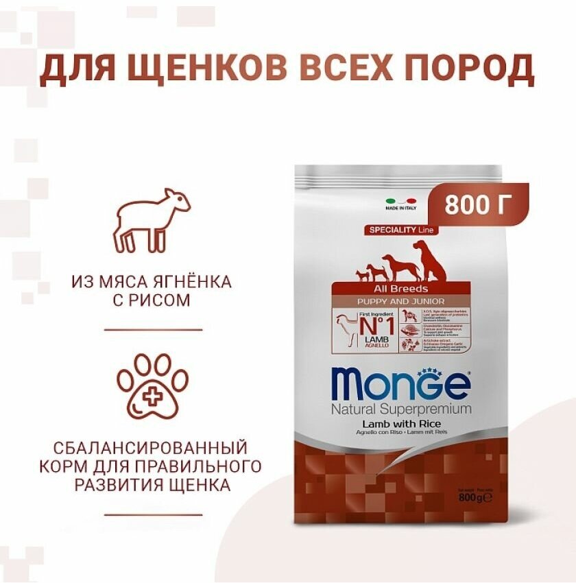 Сухой корм Monge Dog Speciality Puppy&Junior для щенков всех пород, ягненок с рисом, 800 г