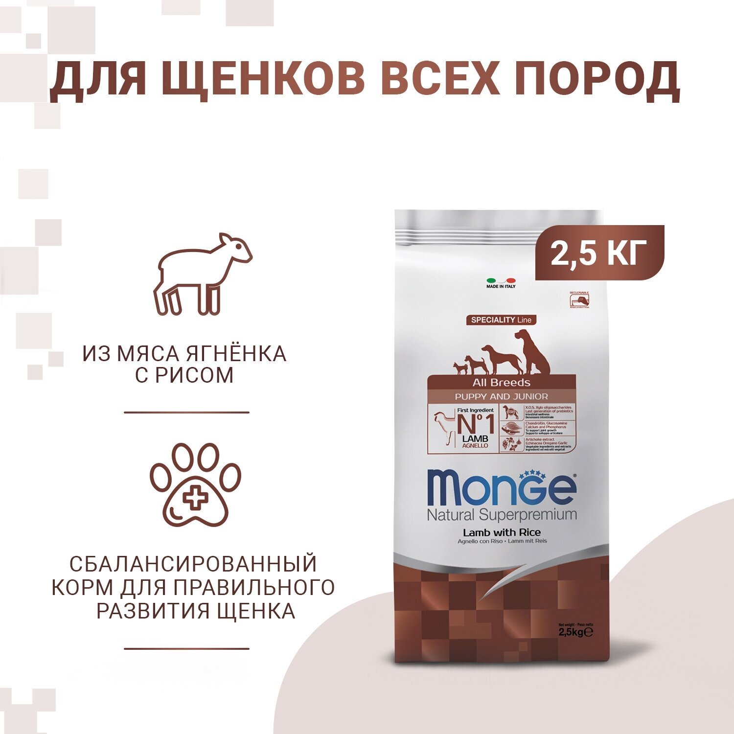 Cухой корм Monge Dog Speciality Line Puppy&Junior корм для щенков всех пород, из ягненка с рисом и картофелем 2,5 кг