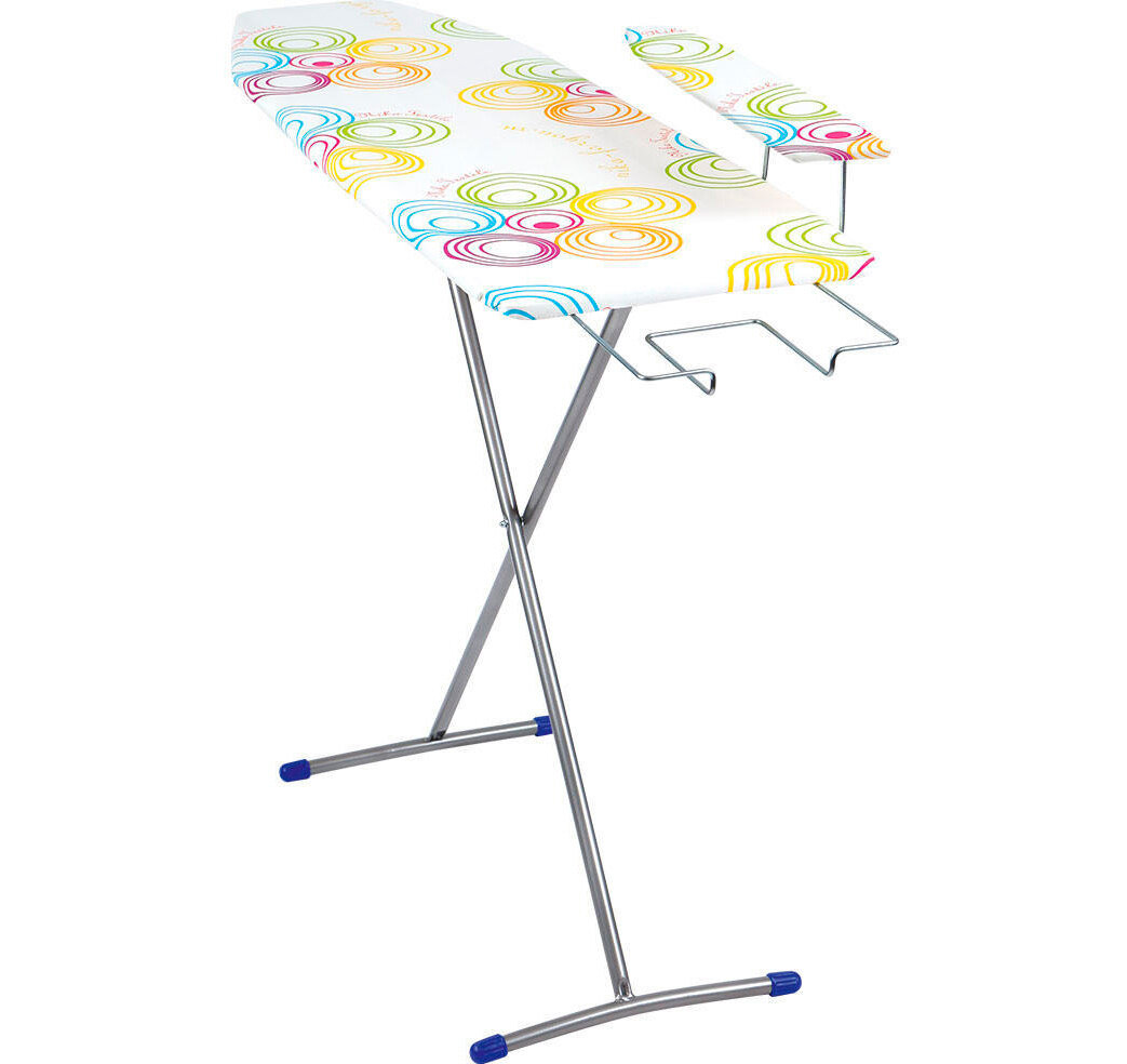 | Плюсы: | Обычная доска, стандартная. Есть подставка для утюжки рукавов(ставится и снимается, когда нужно), есть подставка для утюга (выдвижная). Регулировка высоты-2 положения. |