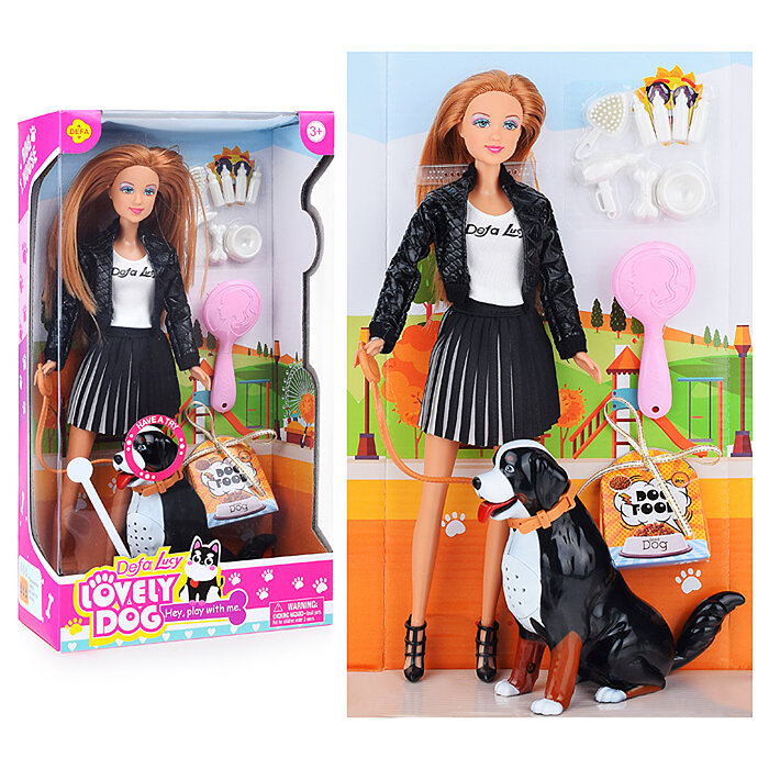 Игровой набор Кукла Defa Lucy На прогулке в черной куртке с собакой, игровые предметы, 29 см 8428d/черная