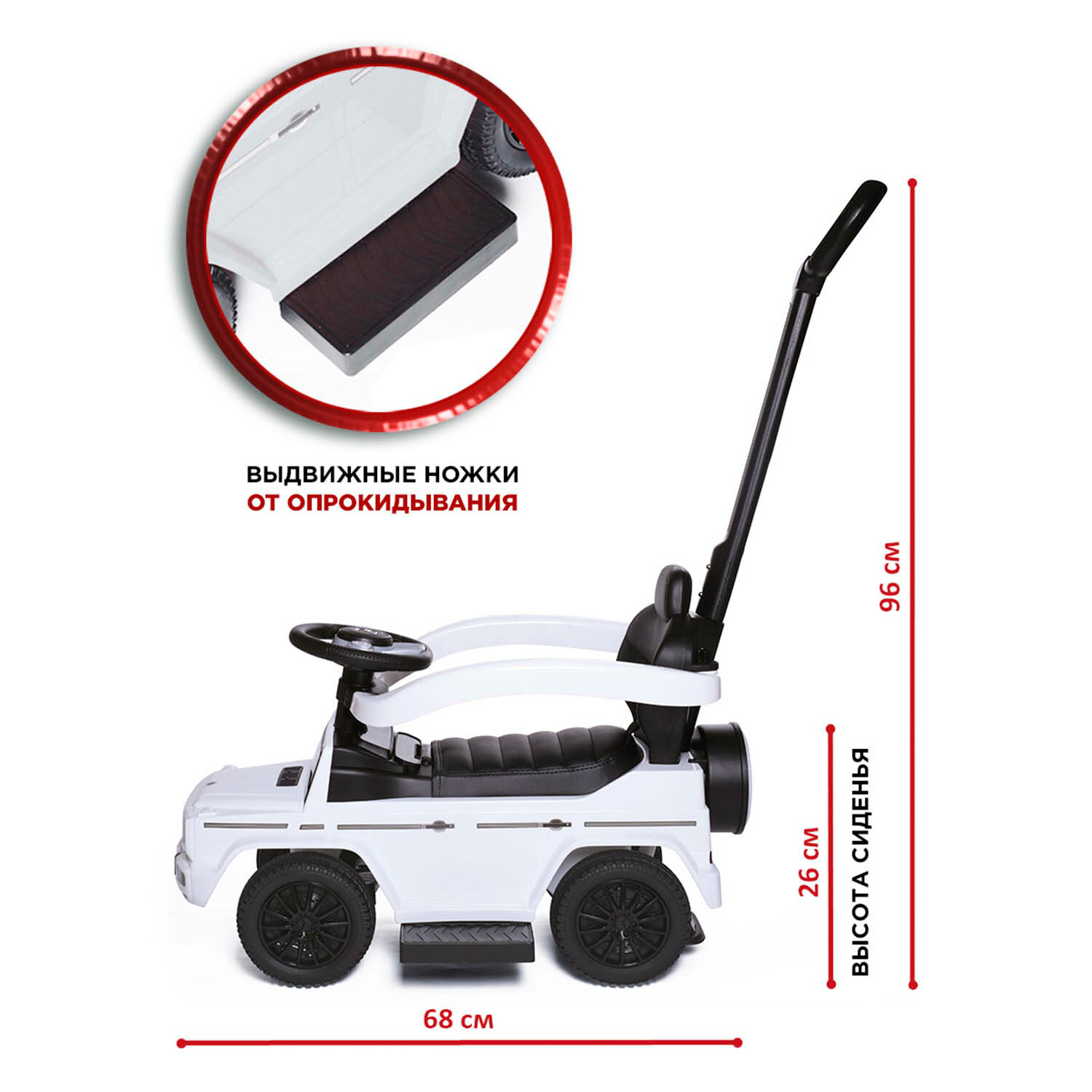 | Дополнительная информация | пушкар каталка; универсальный (2 в 1); съемная ручка для поддержки и управления машинкой, съемная спинка, кожаное сиденье; музыкальный руль: звук клаксона/мелодии заводские; макс. нагрузка: 25 кг |