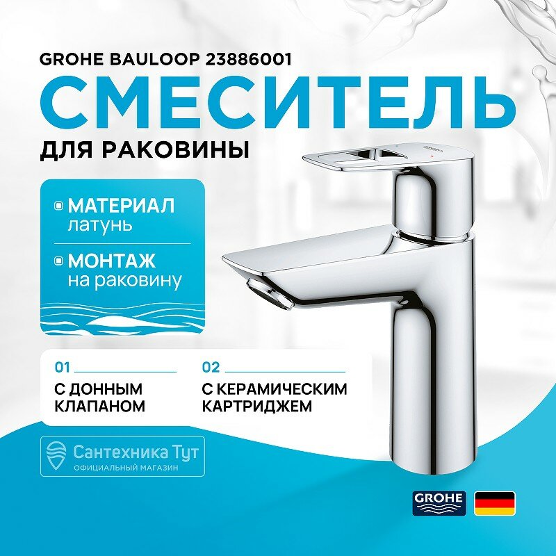 Смеситель для раковины GROHE BauLoop с нажимным донным клапаном, M-Size, хром (23886001)