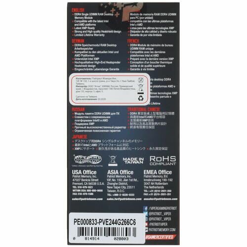 Оперативная память Patriot Viper EliteII PVE244G266C6 DDR4 - 4ГБ 2666МГц, DIMM, Ret