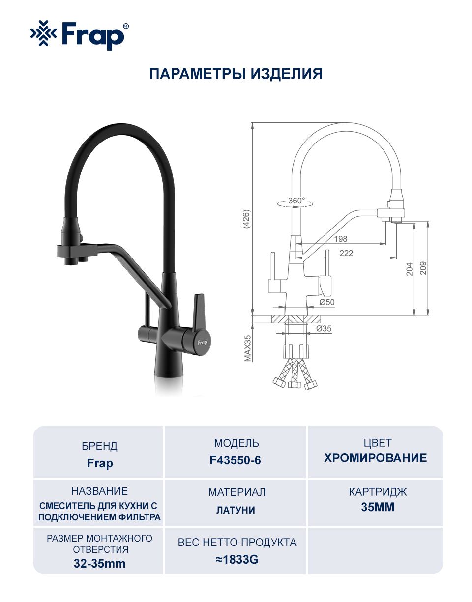 Смеситель для кухни Frap F43550-6 с подключением фильтра, черный