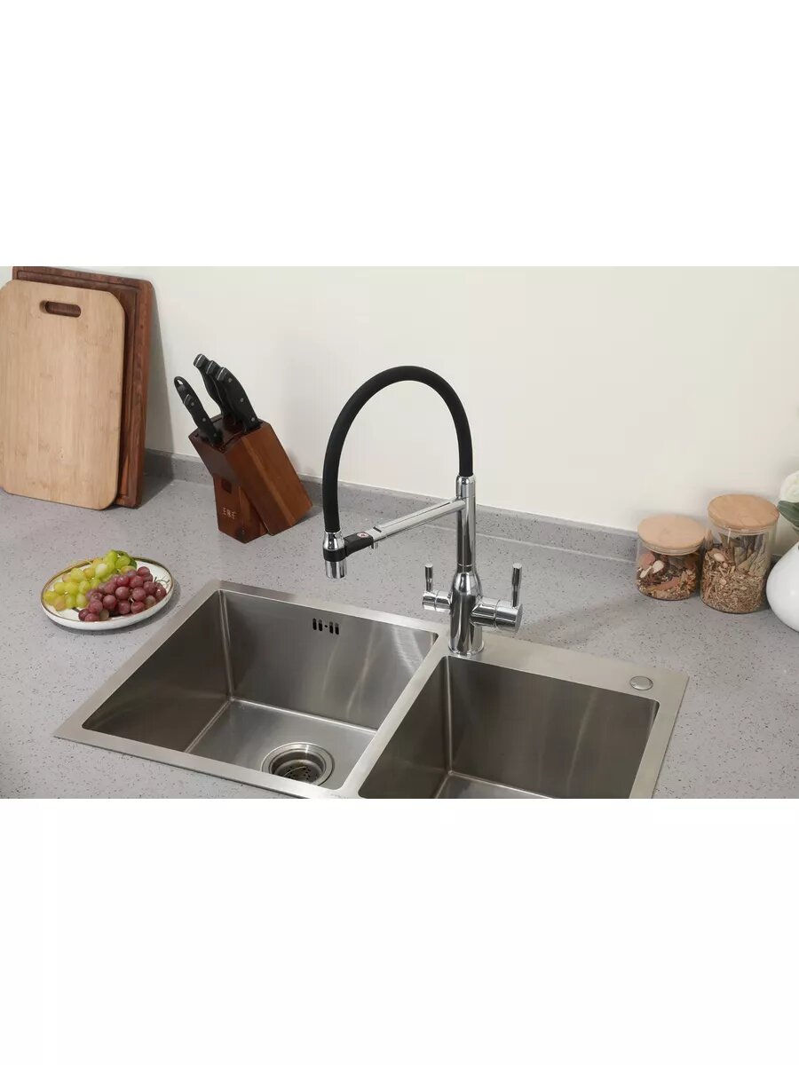 Смеситель для кухни с гибким изливом Frap F4398-5, с фильтром под питьевую воду, цвет сатиновый/черный, латунь