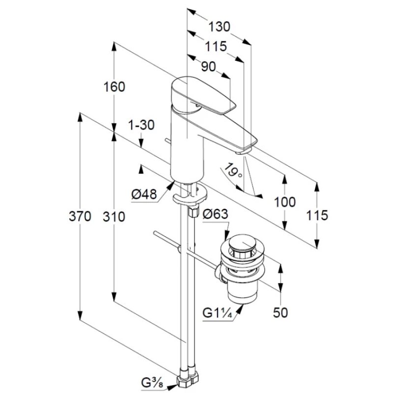 KLUDI PURE&SOLID Однорычажный смеситель на умывальник 100, c донным клапаном, арт. 342900575