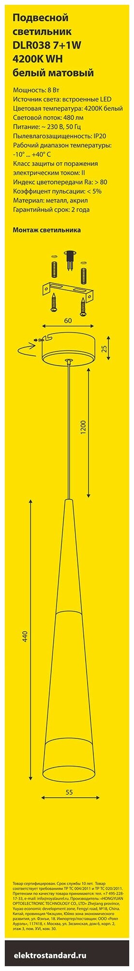 Светильник подвесной Elektrostandard DLR038 DLR038 7+1W 4200K белый матовый