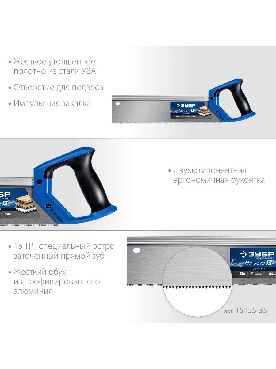 Ножовка с обушком для стусла (пила) Зубр "молния 13" 35 х 11 см, 13 Tpi, точный рез 15155-35_z01 .