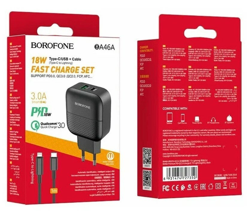 Сетевой адаптер питания Borofone BA46A Premium зарядка 1 порт USB-C PD 18W + USB-A QC3, 3.0А + кабель Lightning, черный