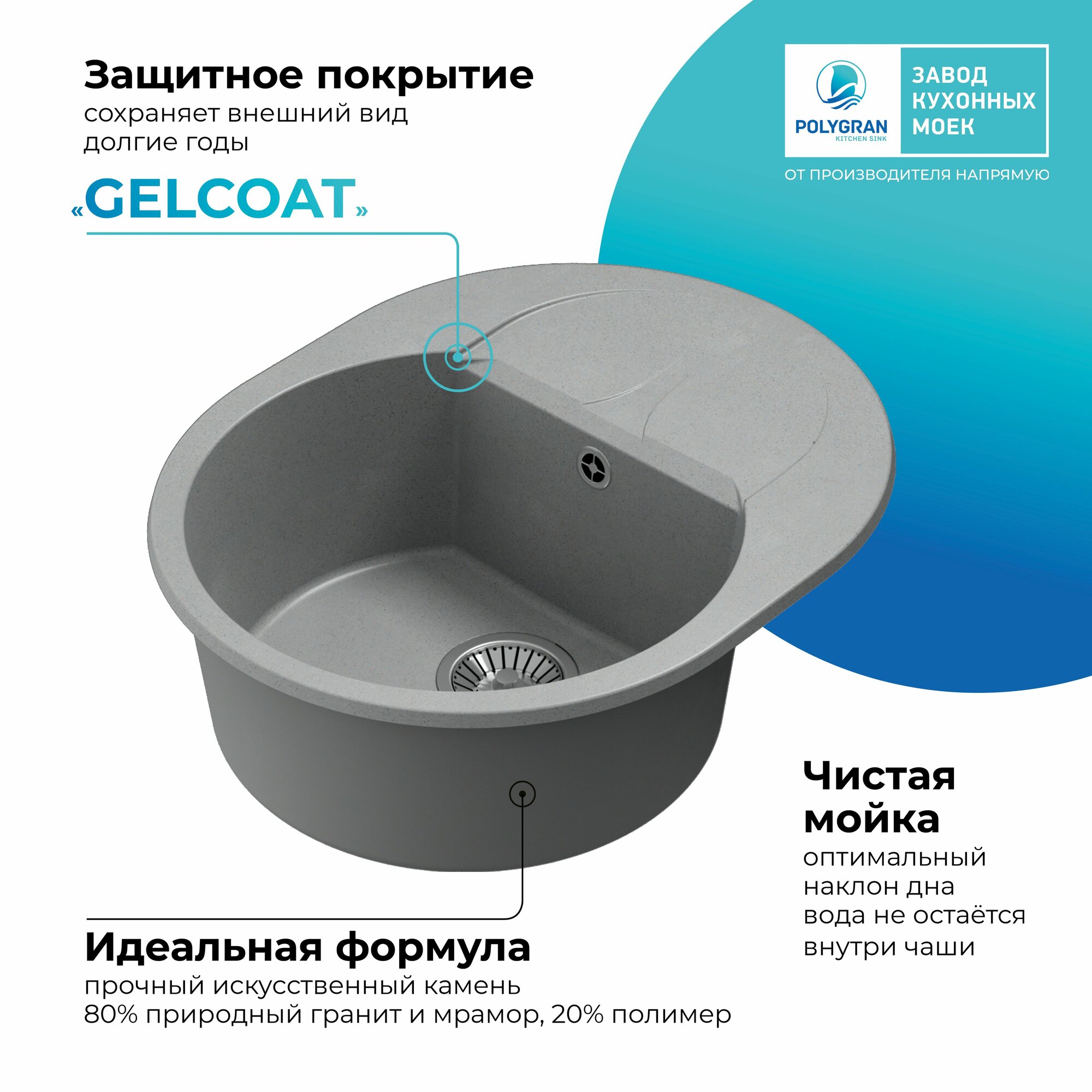 Мойка для кухни каменная POLYGRAN ATOL-620, серая, врезная, круглая, с крылом (№314 Светло-серый)