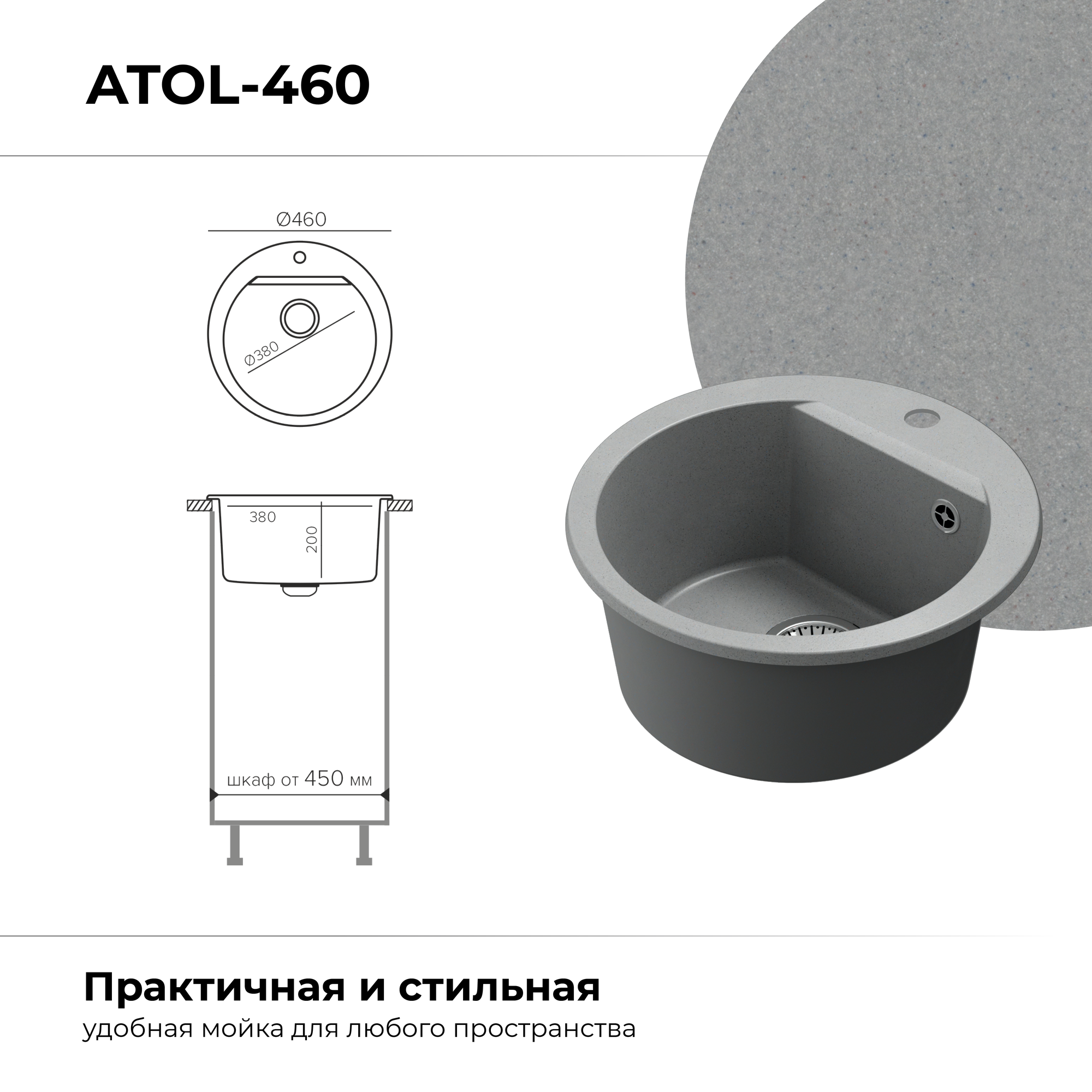 Мойка POLYGRAN, гранит-мрамор, ATOL-460, (d=460*200 мм), серый, сифон и сливная арматура в модуль 450