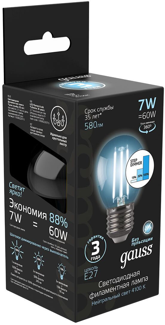 Лампа светодиодная Gauss Filament 7Вт цок.E27 шар 220B 4100K св.свеч.бел.нейт. упак.1шт 105802207-S