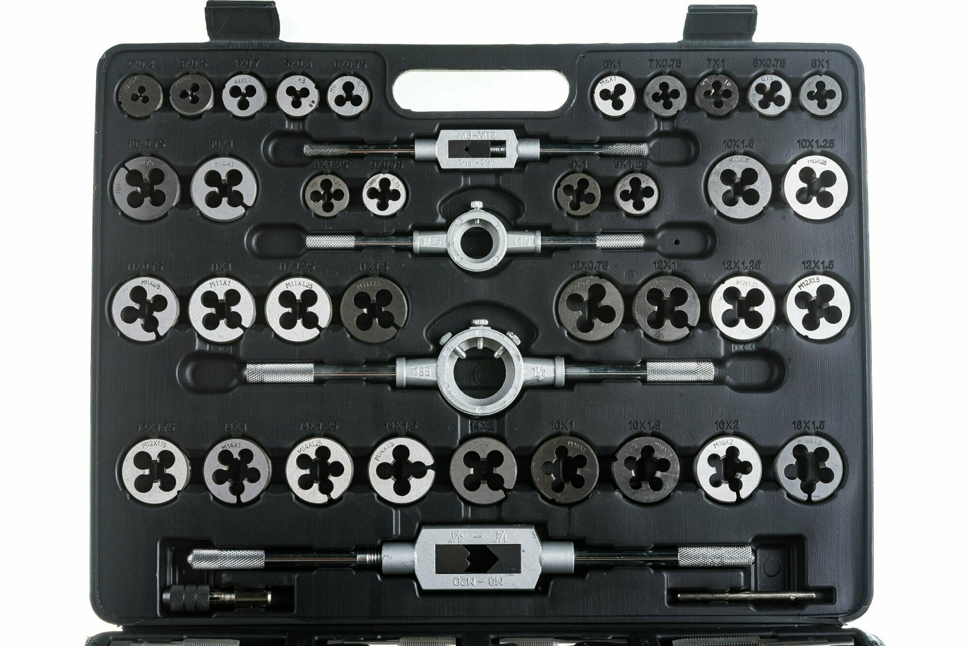 | Подробная комплектация | - 35 плашек и 35 метчиков комплектных из 2 штук: M2x0.4, M3x0.5, M4x0.7, M5x0.8, M6x0.75, M6x1.0, M7x0.75, M7x1.0, M8x0.75, M8x1.0, M8x1.25, M9x0.75, M9x1.0, M9x1.25, M10x0.75, M10x1.0, M10x1.25, M10x1.5, M11x0.75, M11x1.0, M11x1.25, M11x1.5, M12x0.75, M12x1.0, M12x1.25, M12x1.5, M12x1.75, M14x1.0, M14x1.25, M14x1.5, M14x2.0, M16x1.0, M16x1.5, M16x2.0, M18x1.5; - 2 метчикодержателя: M3-M12, M6-M20; - 2 плашкодержателя: ⌀25мм, ⌀32мм; - метчикодержатель Т-образный M3 - M6. |