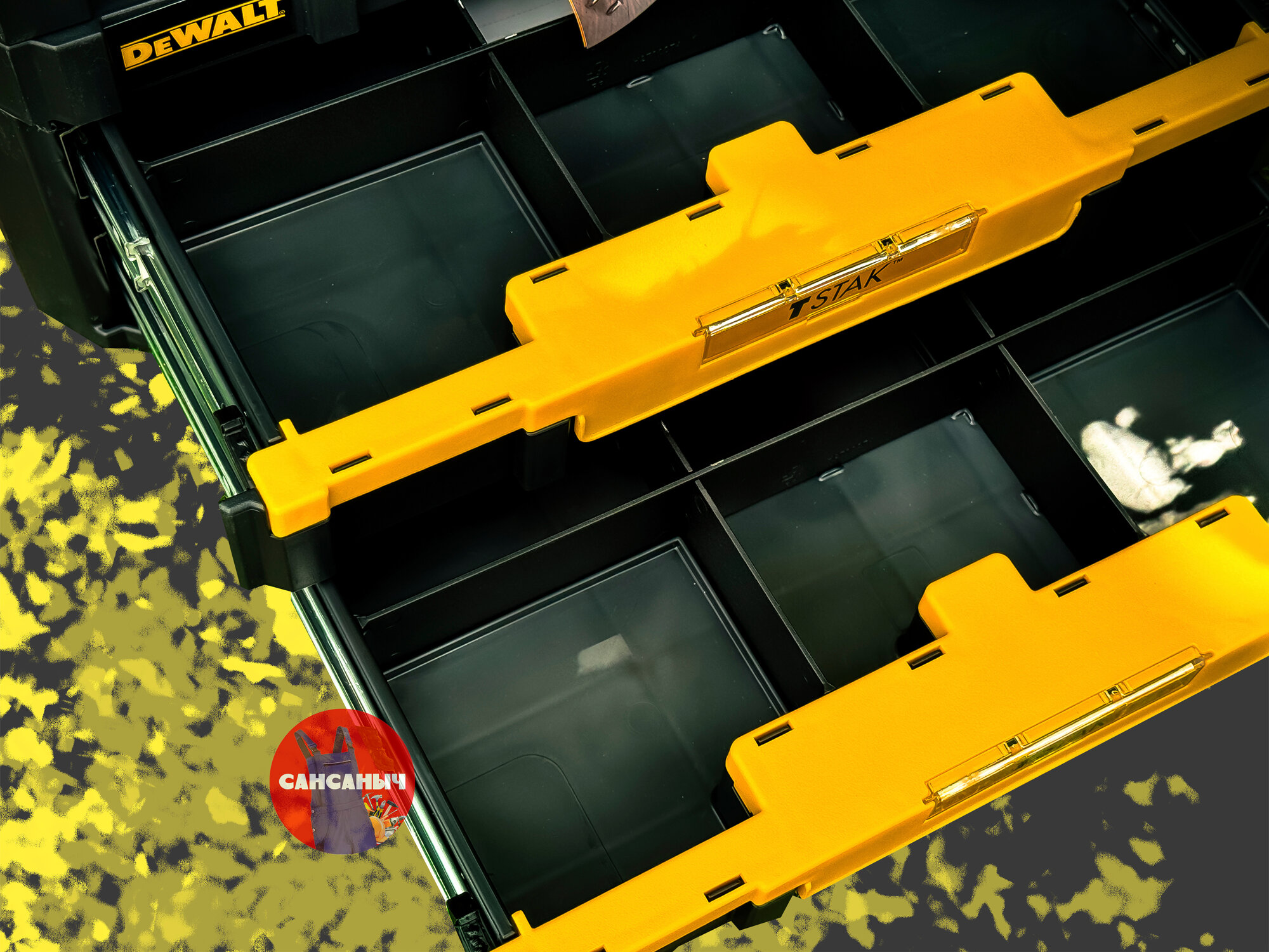 В девольте всё просто, мелочёвка ушла в слейдеры, крупный инструмент в верхнее отделение. Большой плюс, в возможности отцепиить слайдеры от ручного инструмента и нести в разных руках, так как не всегда есть возможность использовать тележку. |