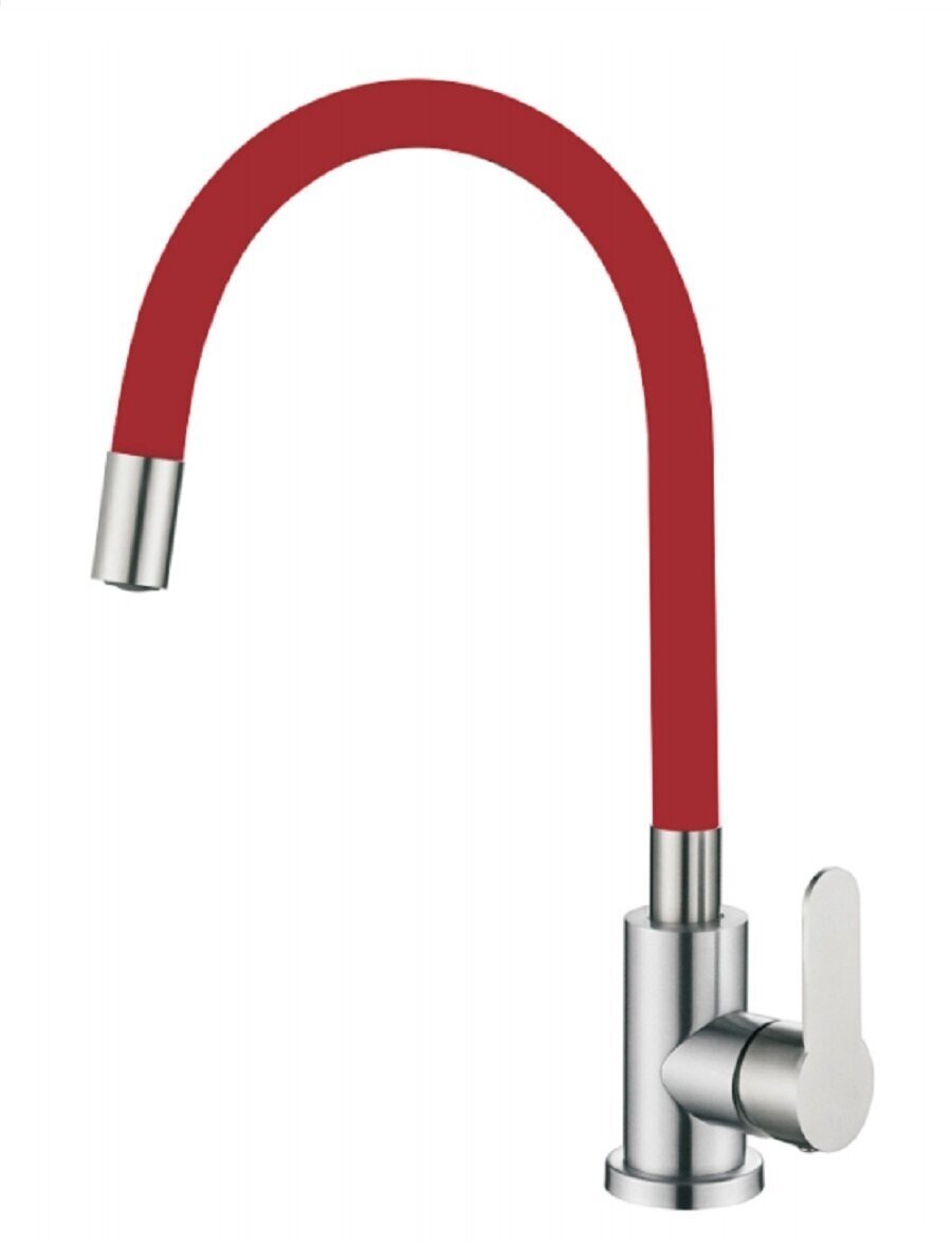 Смеситель для кухни OUTE из нержавеющей стали SUS 304 цвет матовый хром с красным гибким силиконовым изливом.