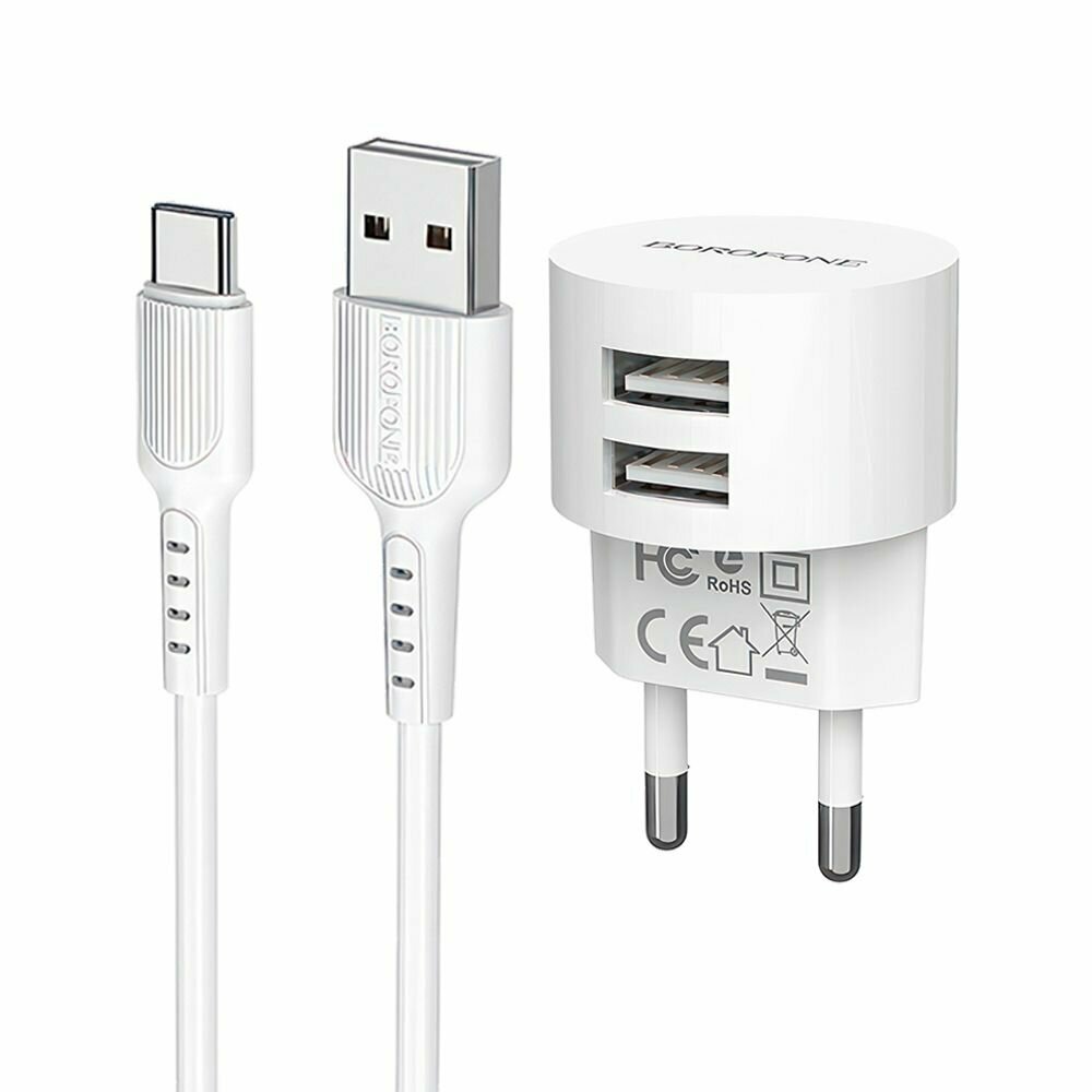 Сетевое зарядное устройство (СЗУ) Borofone BA23A (2 USB) + кабель Type-C, 2.4 А, белый