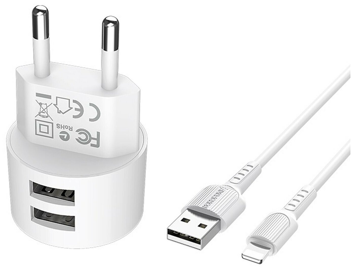 Адаптер сетевой с кабелем Borofone BA23A Brilliant, 2USB, 5V, 2.4A, 12W +Lightning