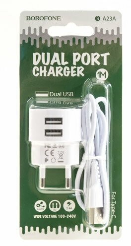 Сетевое зарядное устройство c 2 USB Borofone, BA23A, белое, Type-c