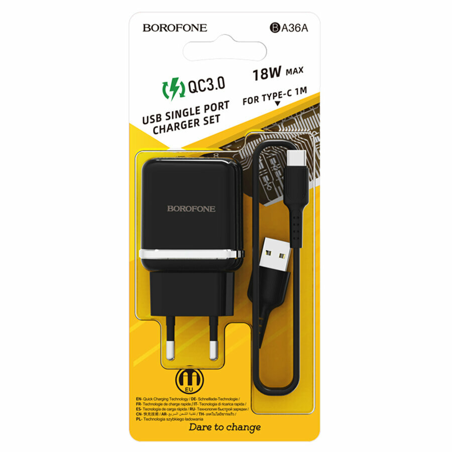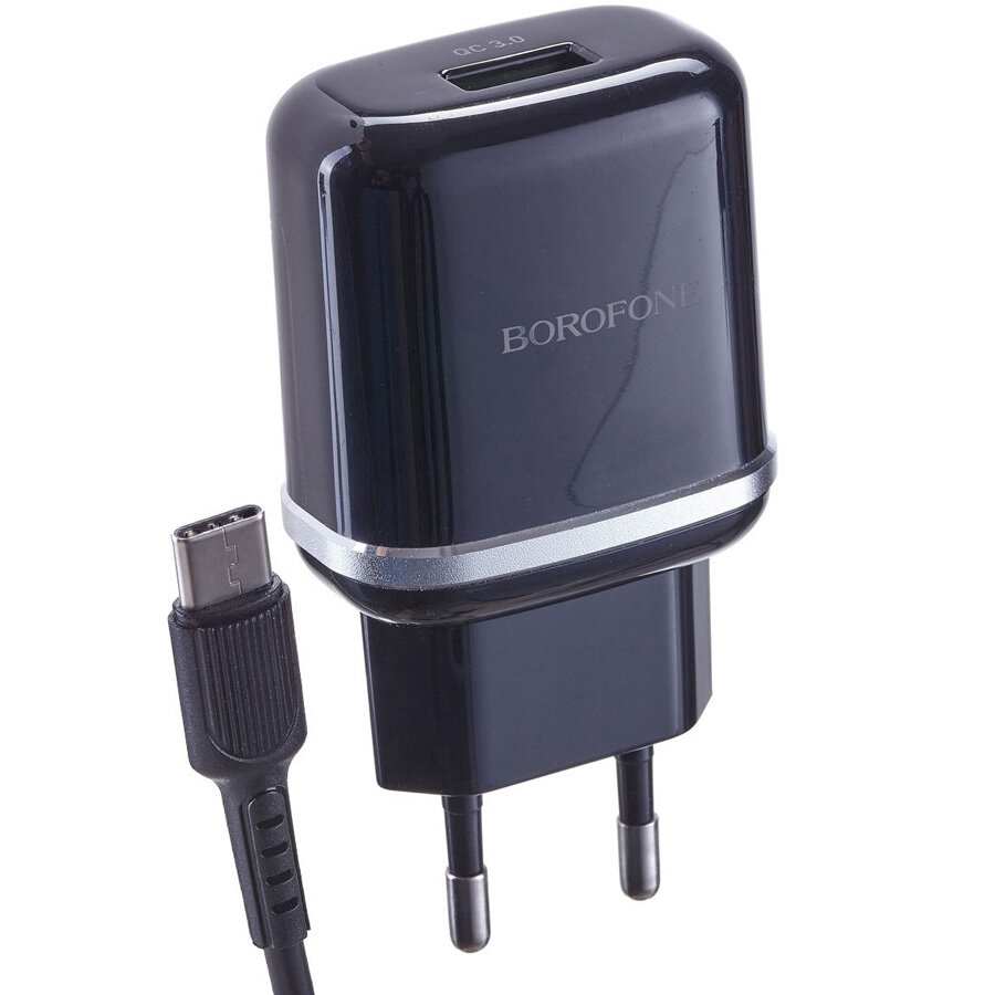 Сетевой адаптер питания Borofone BA36A HighSpeed Black зарядка 3A 18W QuickCharge3 1 USB-порт + кабель USB-C, черный