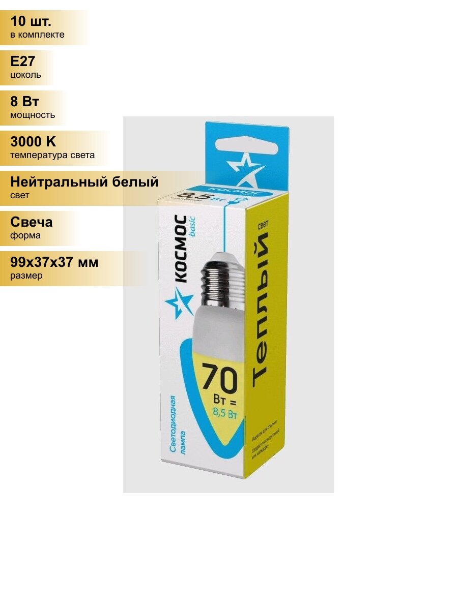 Купить (10 шт.) Светодиодная лампочка Космос свеча E27 8,5W (8W) (720lm) 3000K 2K матов. 99x37 LkecLED8.5wCNE2730 Нейтральный белый. Цоколь E27