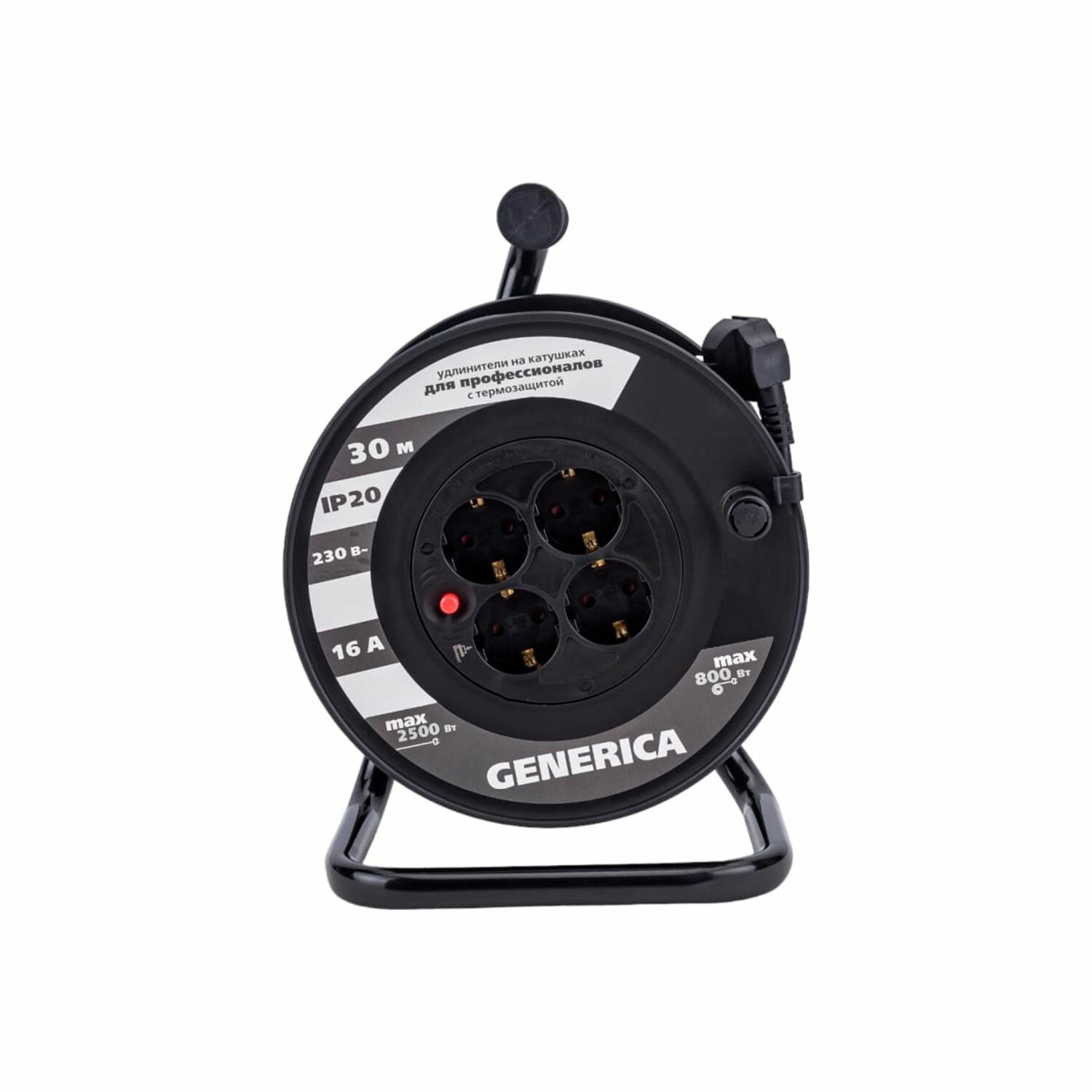 Удлинитель силовой на катушке Generica / Дженерика УК20 с термозащитой 2P+PE, провод ПВС 3х1.5, 4 розетки черный, 20м, WKP20-16-04-20-G / электрика