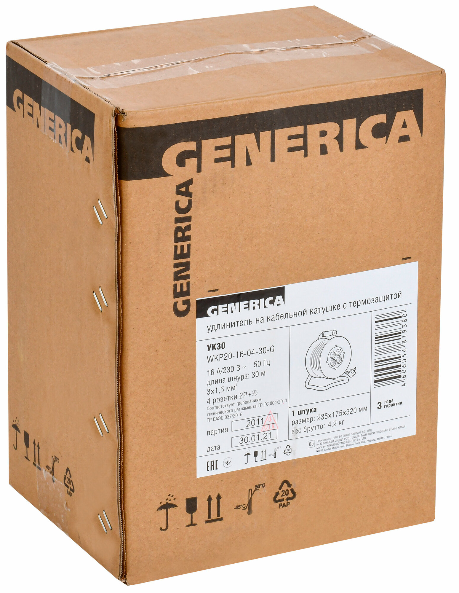 Удлинитель на катушке Generica УК30, 4 розетки, с т/з, с заземлением, 3 x 1,5 мм², 30 м