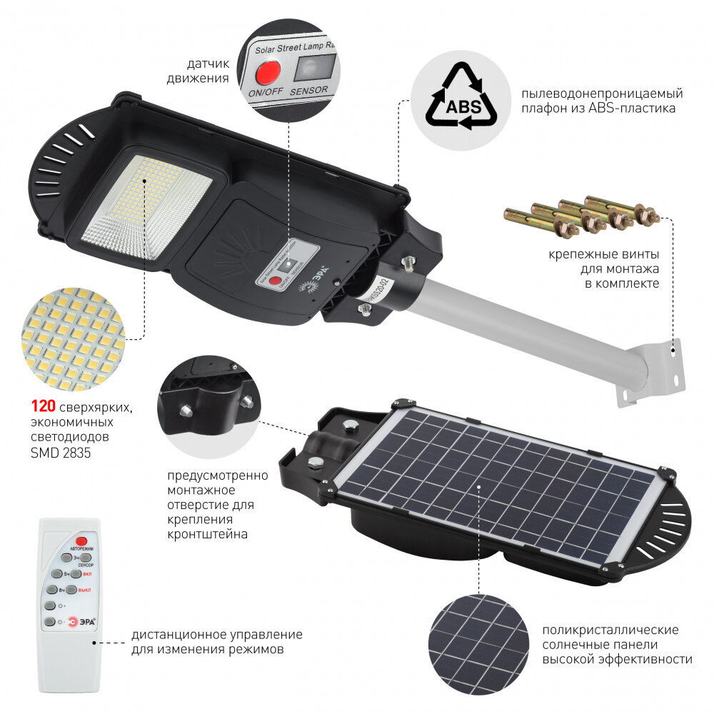 Консольный светильник на солн. бат.,SMD,с кронштейном,20W, с датч. движ.,ПДУ,400lm, 5000К, IP65 () ЭРА Б0046798 (1 шт.)