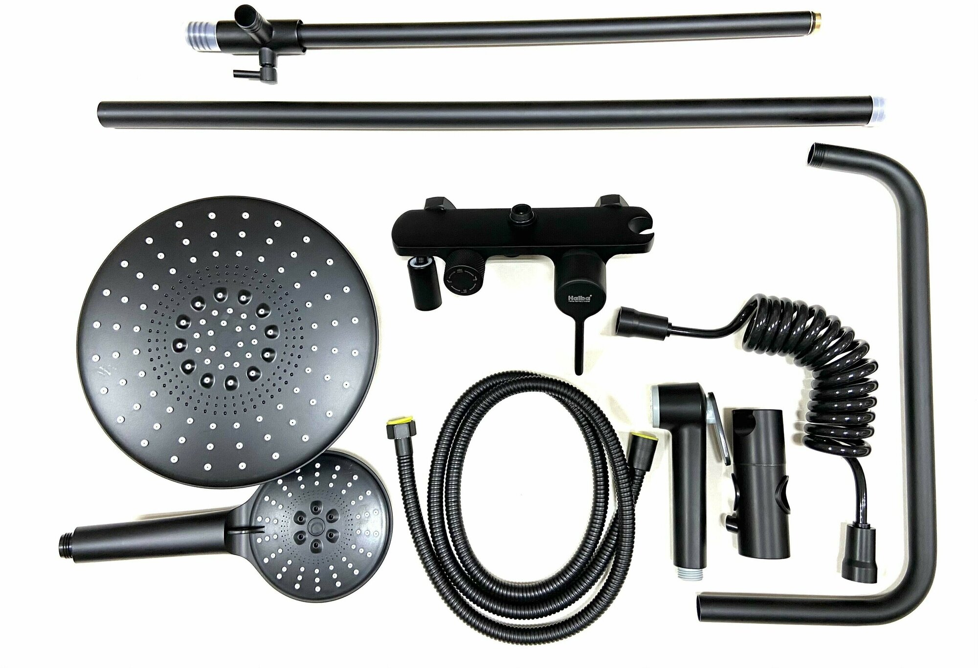 Душевая система, душевой гарнитур с верхним душем, смесителем, изливом и ручной лейкой, черный