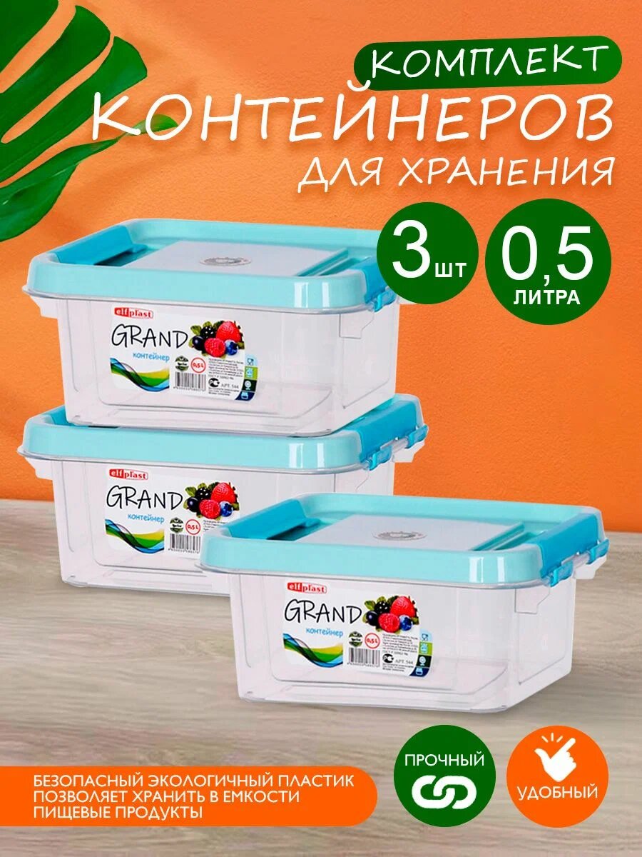 Купить Контейнер elfplast "Grand" для хранения пластиковый с крышкой 0,5 л 3 шт, (прозрачный) 544