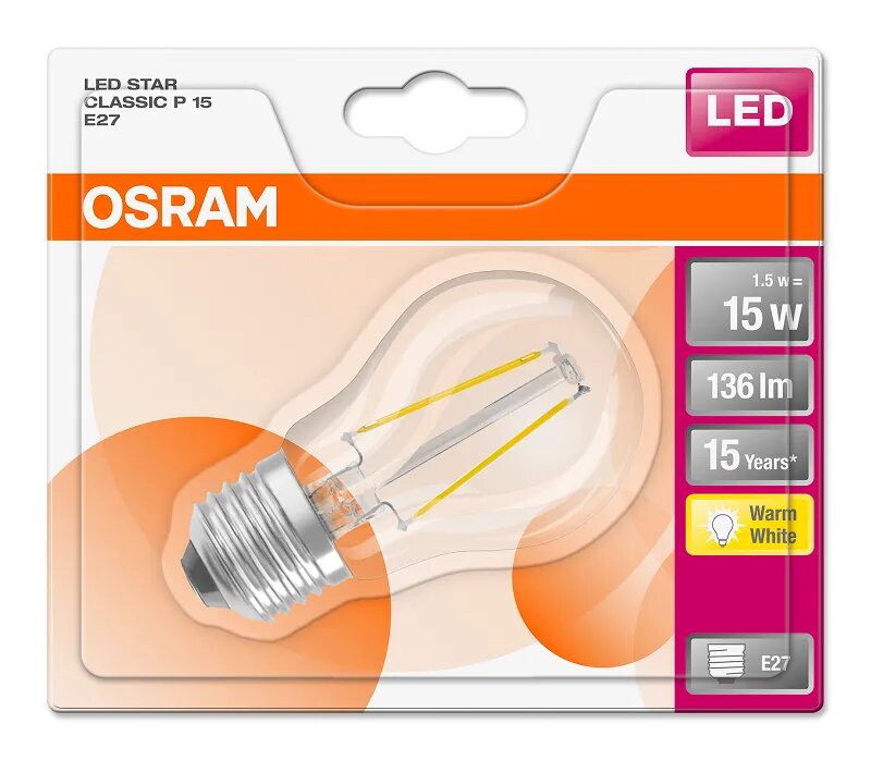 3 шт/уп. Лампа LED Шарик 1.5Вт 220-240В E27 136Лм 2700К Угол 300 град. d 45mm h 77mm Филаментная Стекло Свет Теплый белый Osram, уп. 3шт