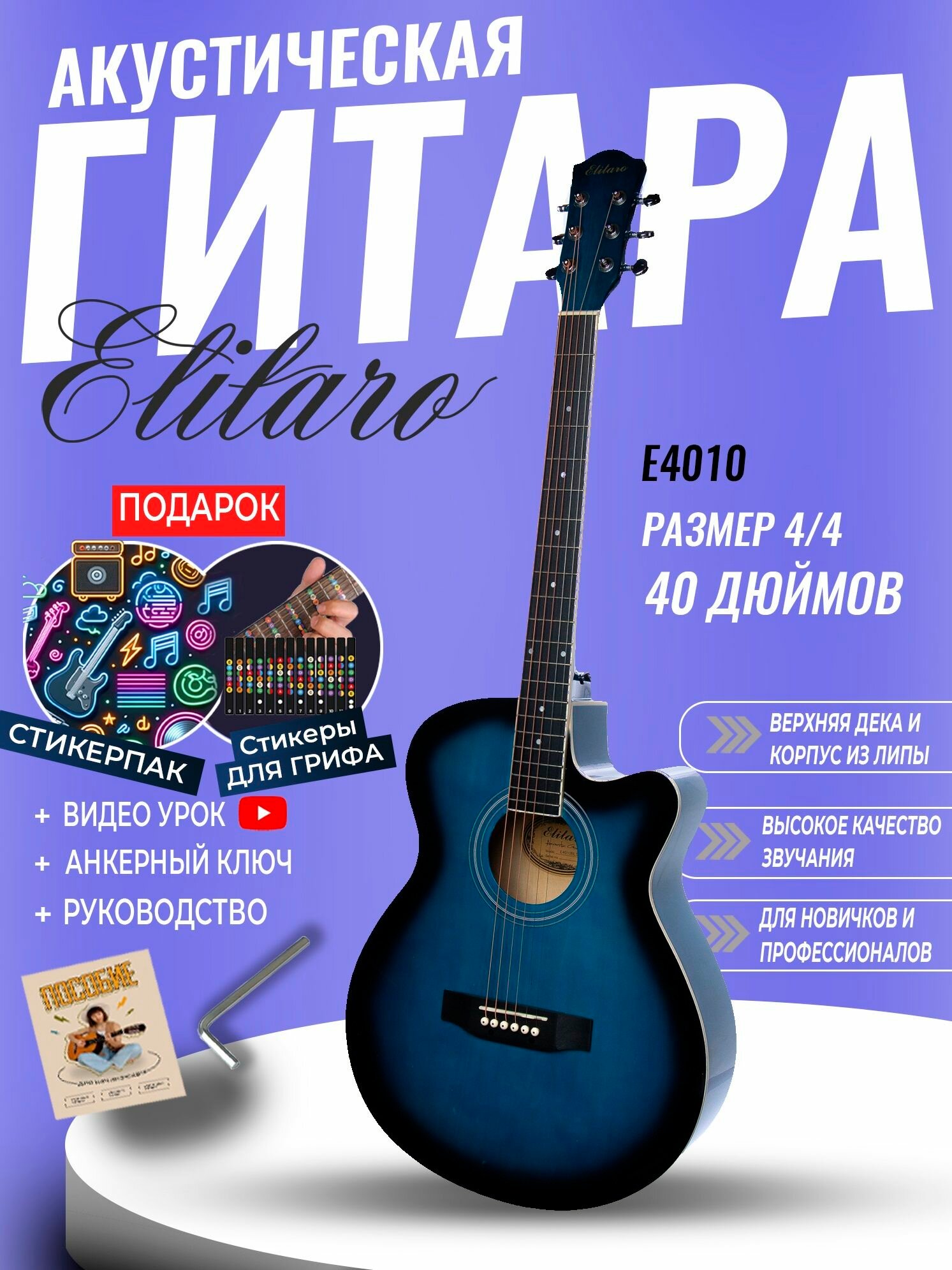 Ниже Вы можете прочитать отзывы на Гитара акустическая 40" Синяя (Инструмент начинающего музыканта, Elitaro E4010 BLS), ознакомится с подробными характеристиками, посмотреть интересные обзоры и фотографии на Гитара акустическая 40" Синяя (Инструмент начинающего музыканта, Elitaro E4010 BLS).