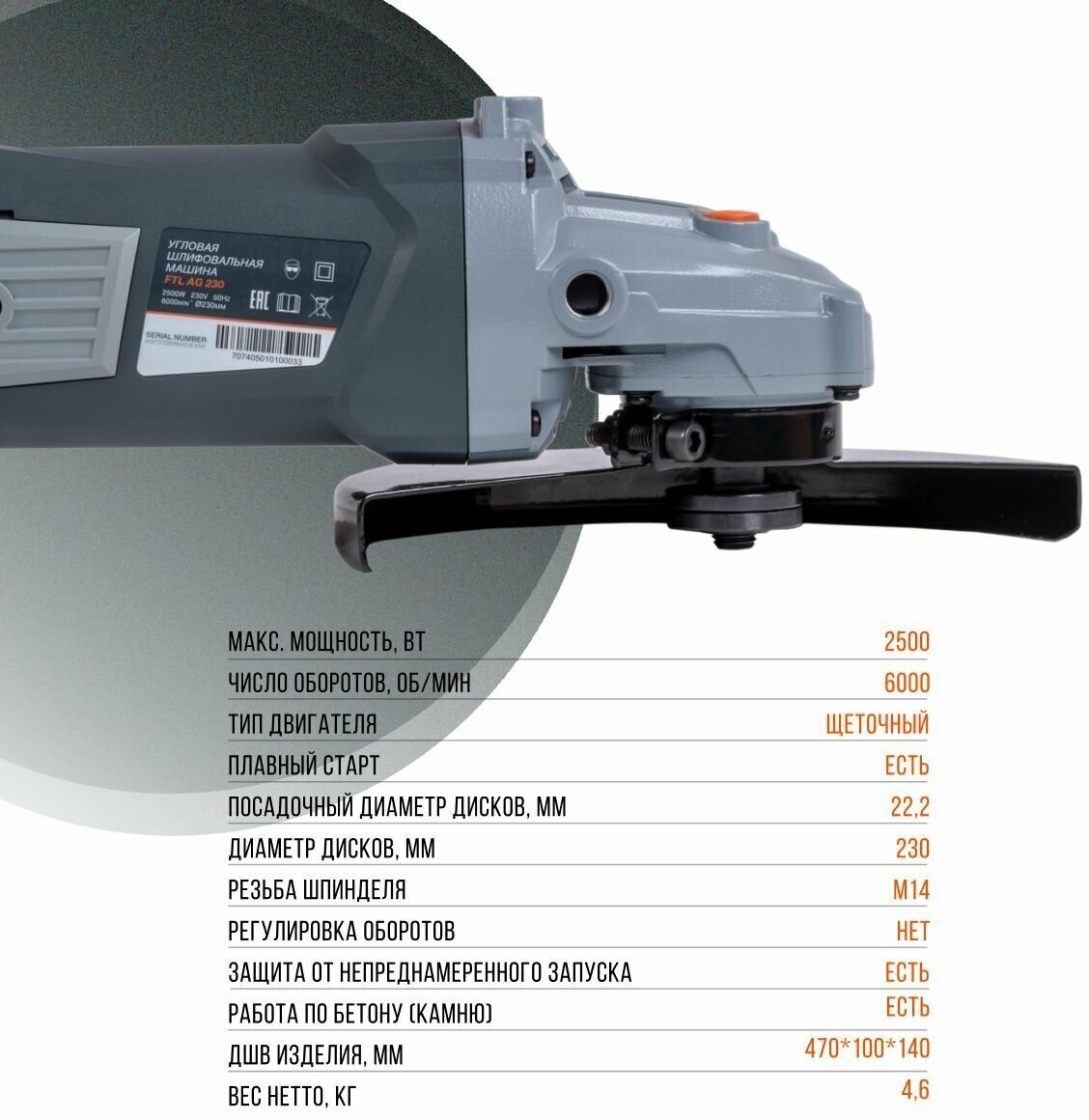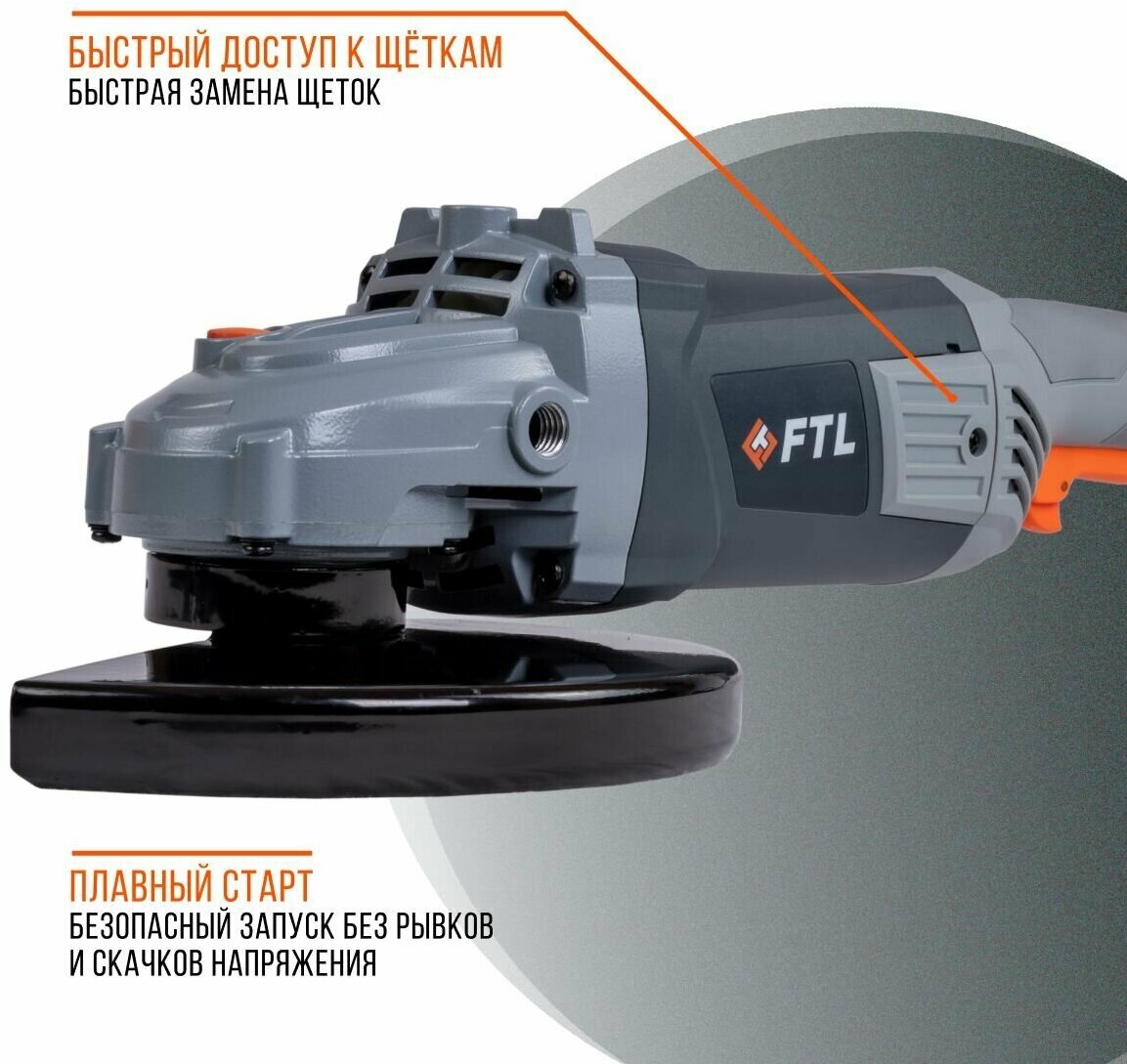 Купить Угловая шлифмашина FTL AG230, для металла/камня, 230мм, 2500Вт, с кожухом, с плавным пуском - 7074