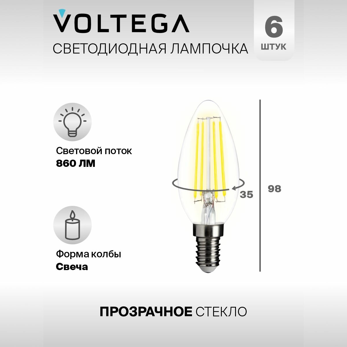 Лампочка светодиодная E14 форма свеча 9W теплый свет Voltega Crystal Graphene Candle 2800K 1 шт. Упаковка 6 шт.