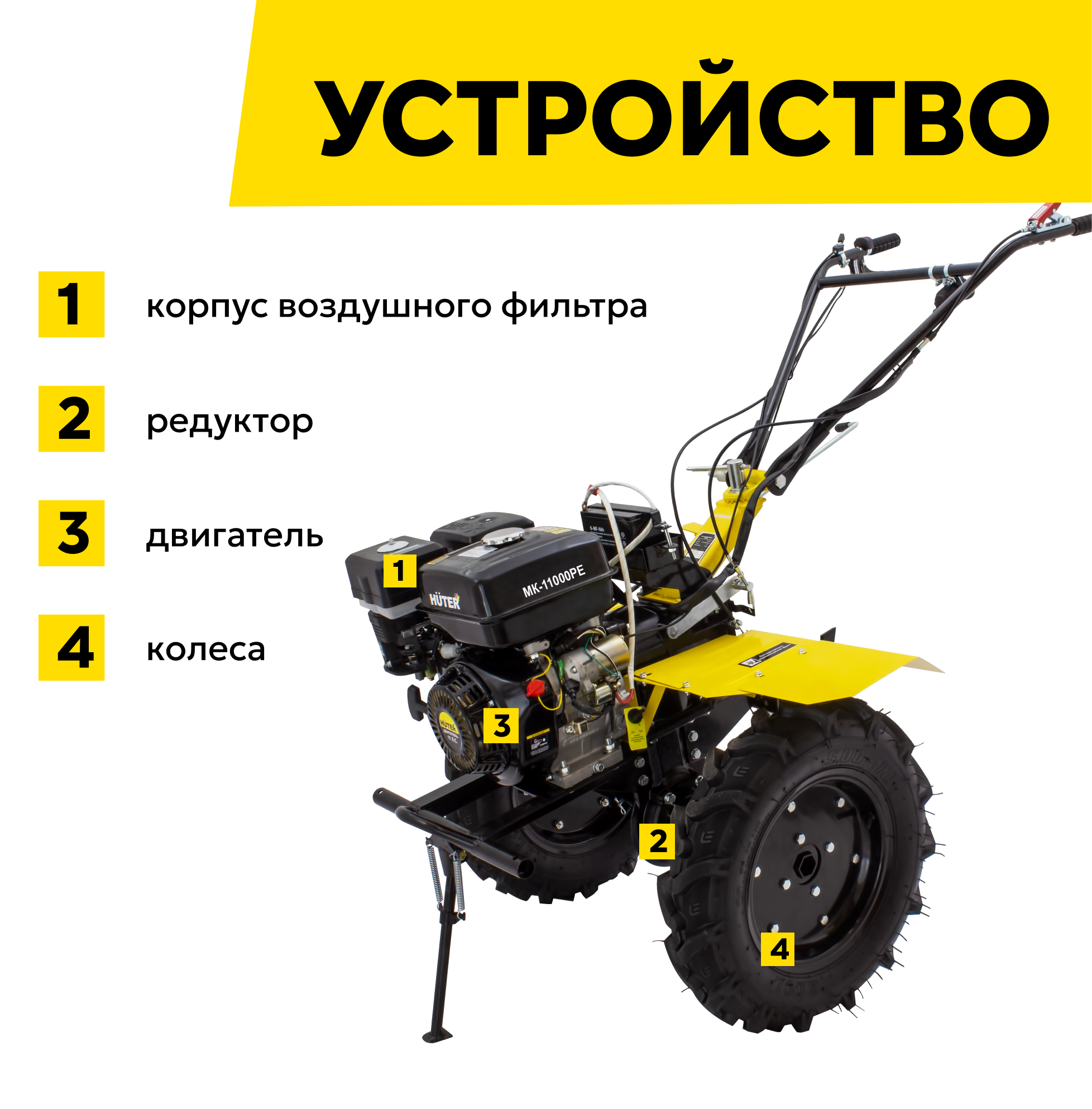 Сельскохозяйственная машина HUTER MK-11000PЕ, 11 л. с, четырехтактный, электростартер, бензин, бак–6 л, ширина–115 см интересное: