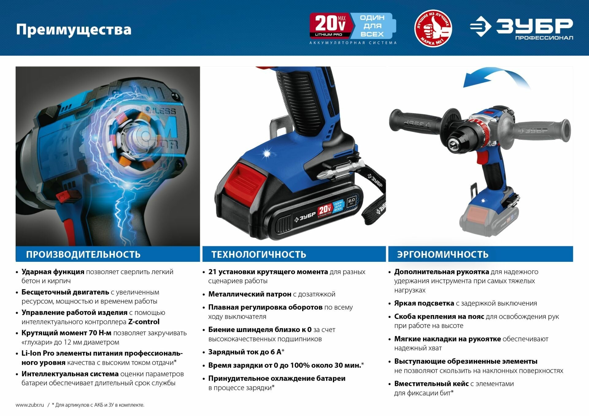 Купить Бесщеточная ударная дрель-шуруповерт ЗУБР Т7 DBS-201-22, 20 В, 70 Нм, 2 АКБ (2 Ач), кейс, Профессионал