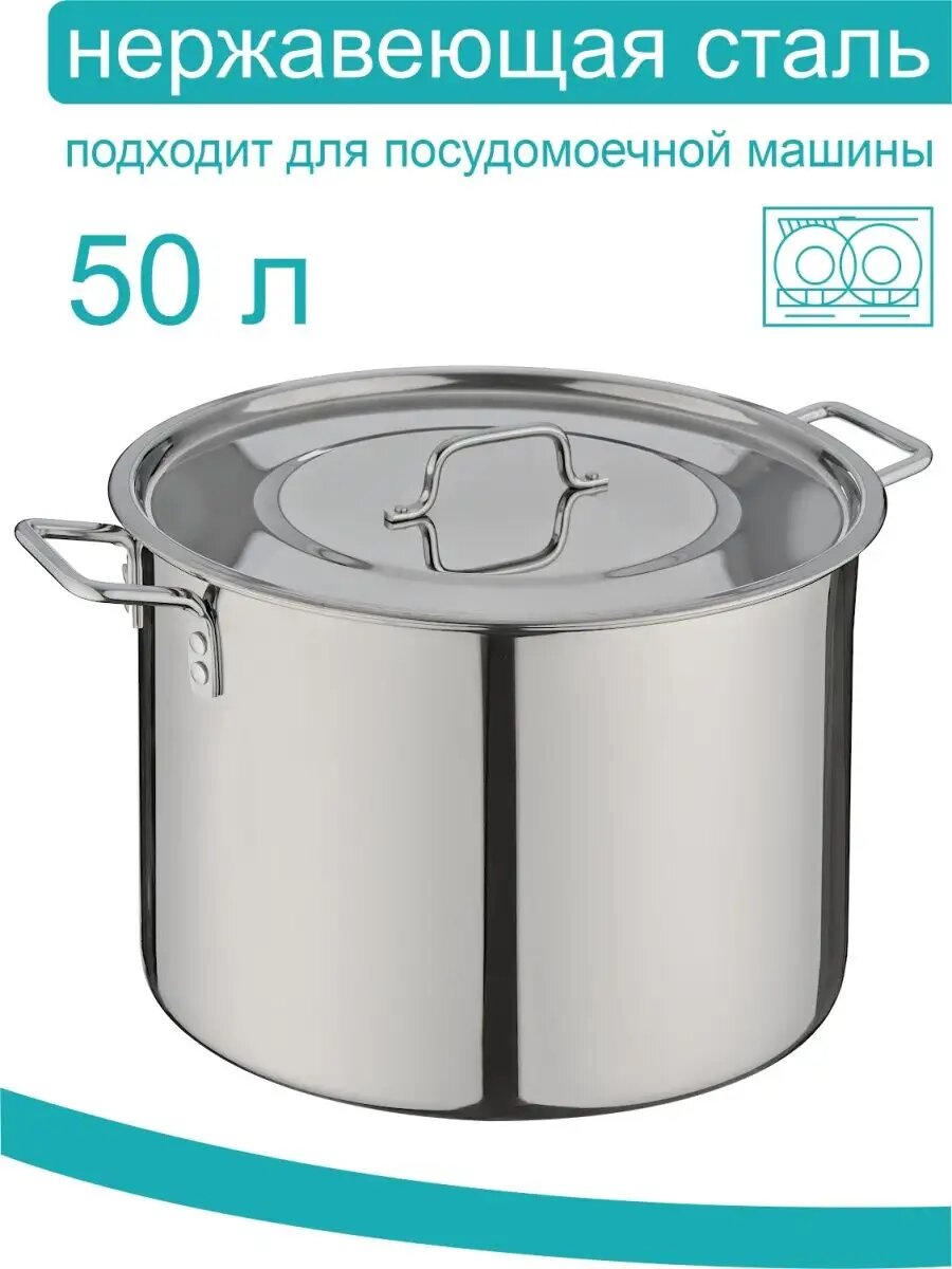 Кастрюля для приготовления из нержавеющей стали сварная "Общепит", котел пищевой, клёпаные ручки, металлическая крышка, 50 л, d=50 см, h=26 см