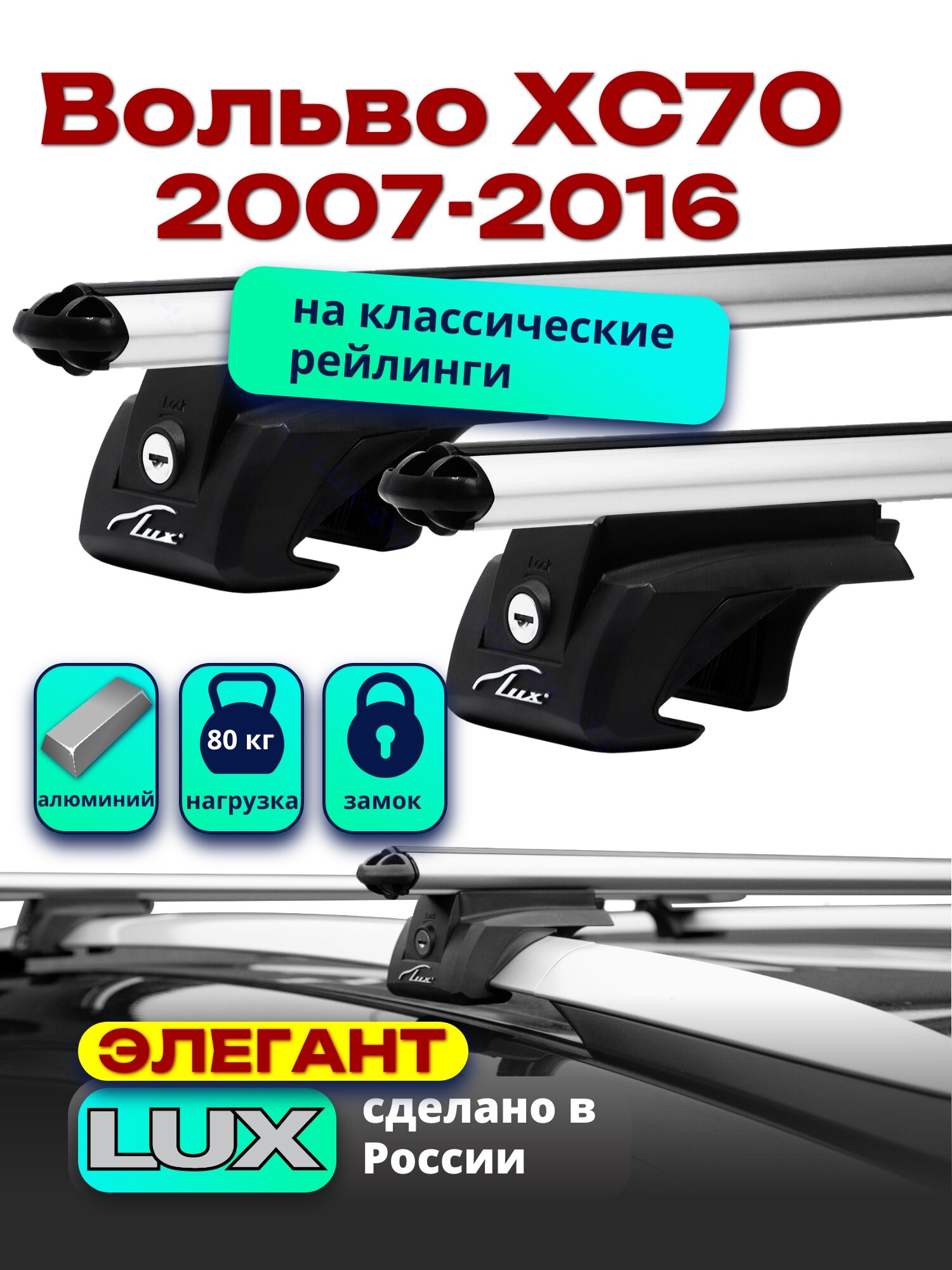 Багажник на крышу LUX элегант с замками, прямоугольные дуги 1,2м на Вольво ХС70 (с рейлингами) 2007-2016, арт:21324-04