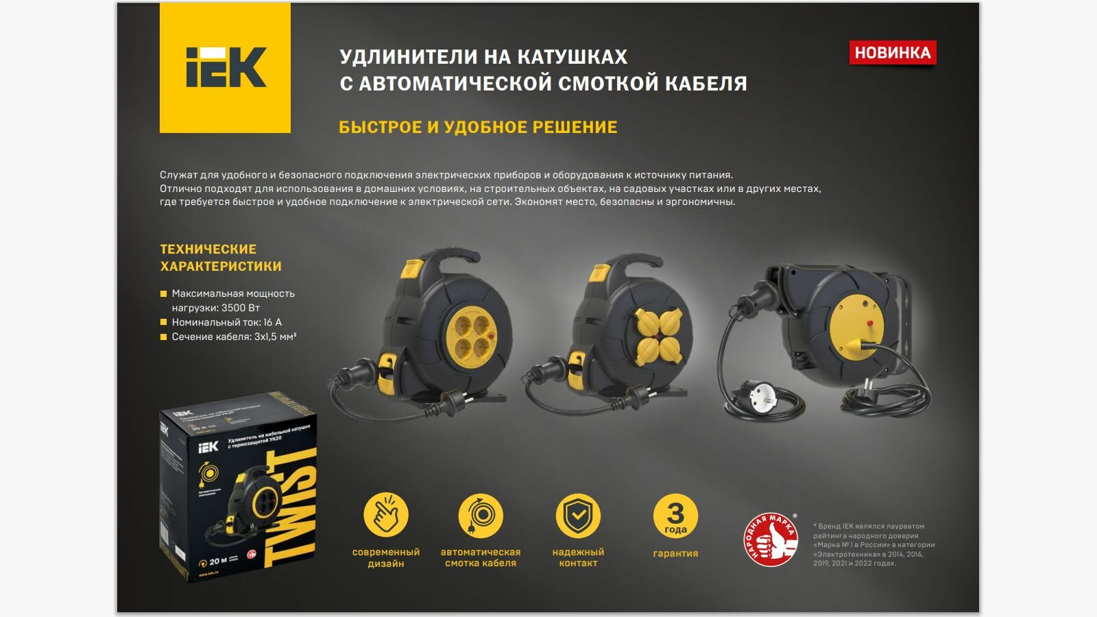 СохранитьУдлинитель TWIST Катушка 1 место УК15 розетка 2P+PE/15м+2м 3х1,5мм2 автосмотка IEK интересное:
