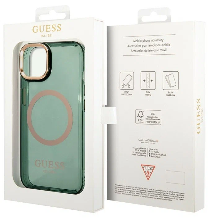 Guess чехол для iPhone 14 Plus, Metal outline Translucent зеленый/золотой (MagSafe)