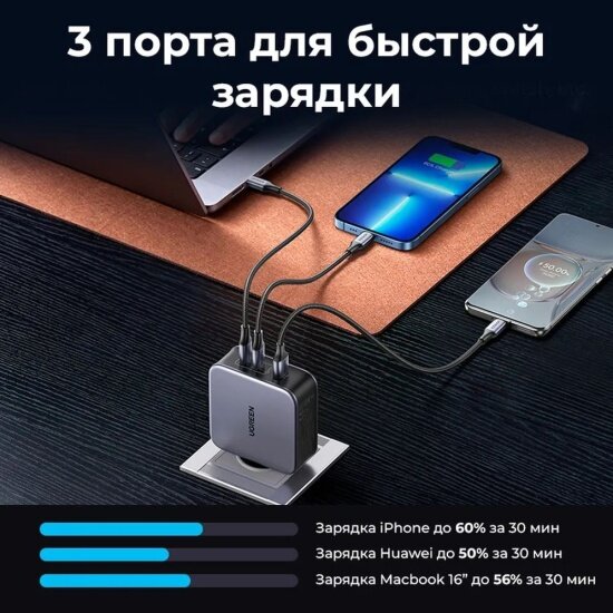 СохранитьСетевое зарядное устройство Ugreen CD289 USB-A+2*USB-C 140W GaN Tech Fast Charger с кабелем USB-C - USB-C, 2м, черный интересное: