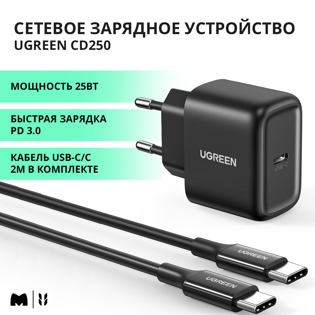 Купить Сетевое зарядное устройство 25Вт с кабелем USB-C/C UGREEN CD250 / Быстрая зарядка PD 3.0 + кабель 2м / цвет черный (50581)